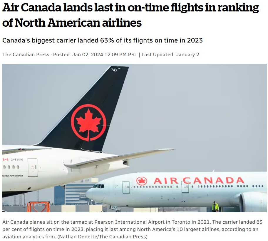 오른쪽 - 북미항공사 10개 중 정시 운행률이 최악이라는 뉴스, 정시 착률율이 63% (지연 기준은 15분부터)