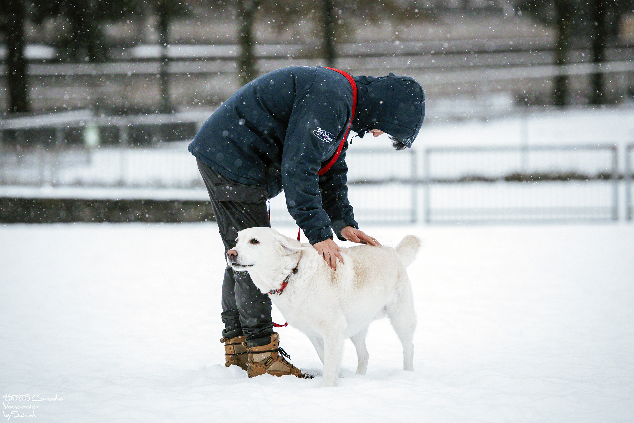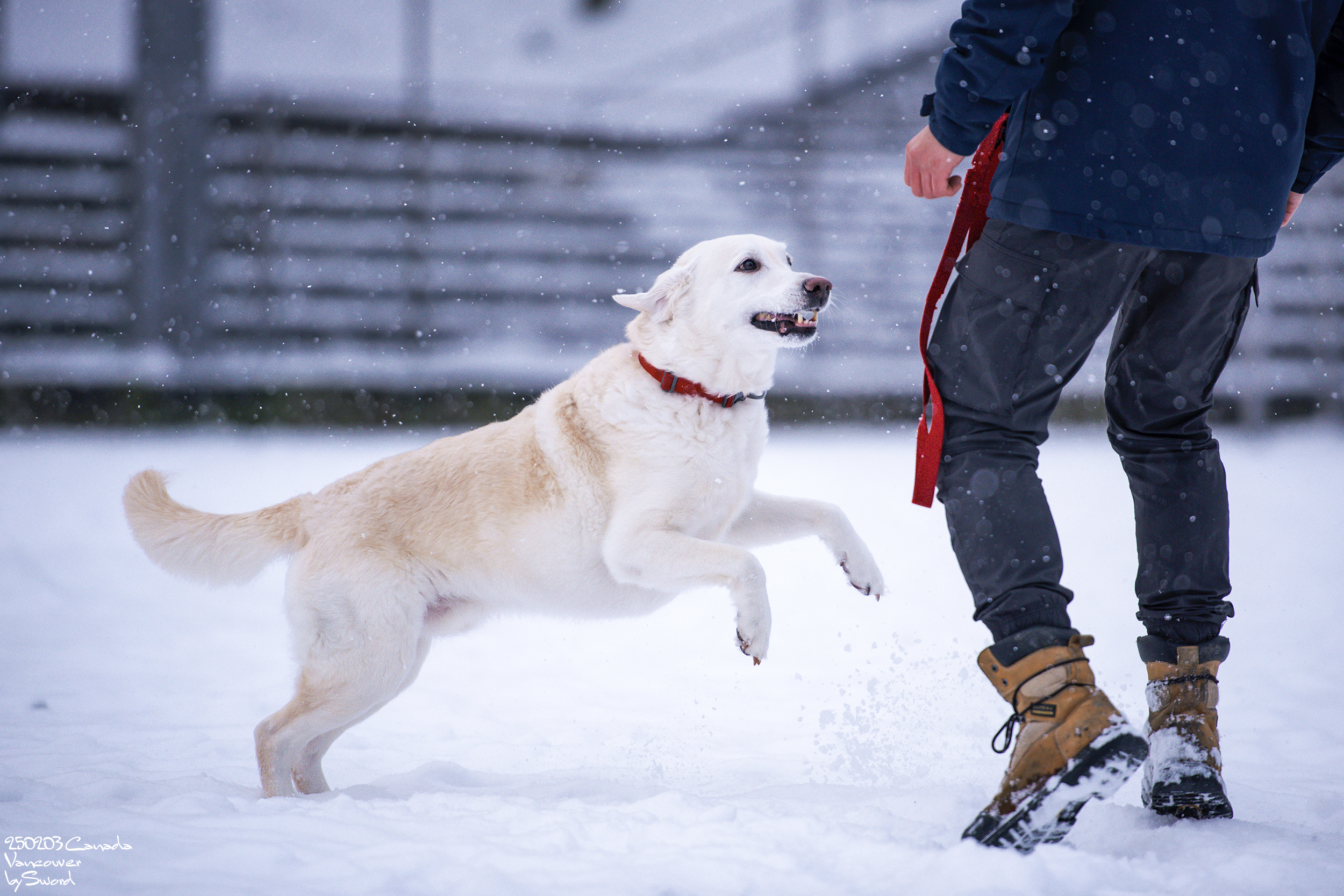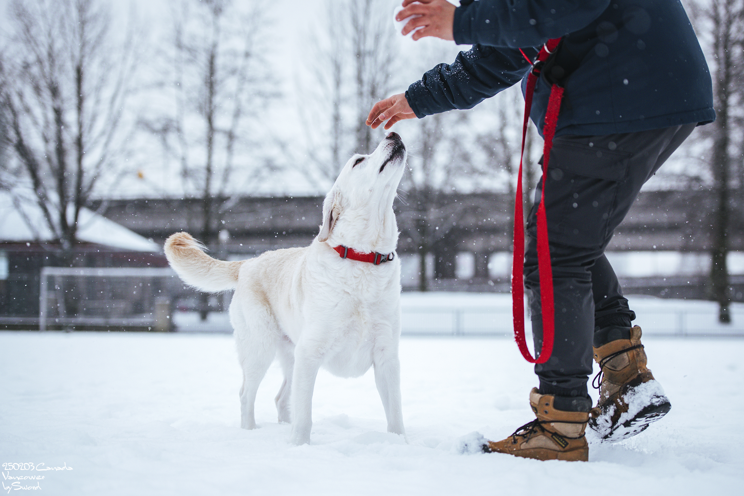 신나는 개를 위해 추워서 손이 새빨개졌는데도 들어가지 않고 놀아주는 견주에 감정이입 ㅠㅠㅠ